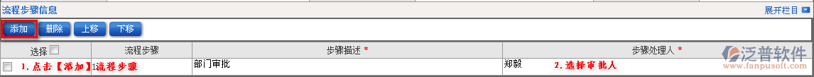 2.填寫流程名稱,使用部門范圍,是否短信提醒等,最后進入流程步驟設置。點擊【添加】