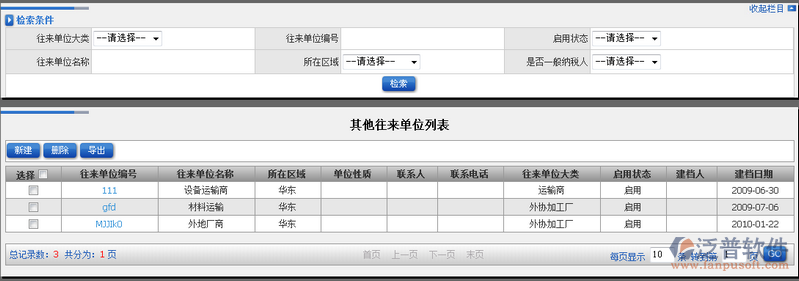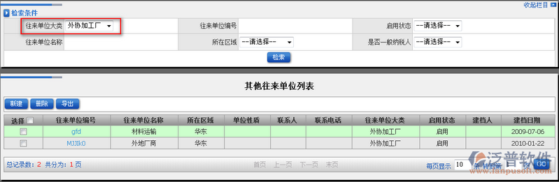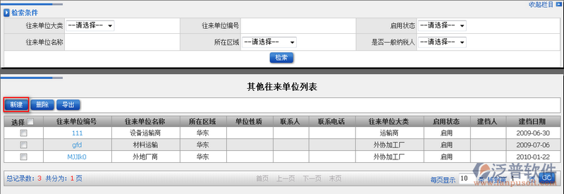 其他往來單位可以對外地或者零時的往來單位進(jìn)行存放。其他往來單位可以通過:往來單位大類、往來單位編號、啟用狀態(tài)、往來單位名稱、所在區(qū)域等進(jìn)行模糊查詢