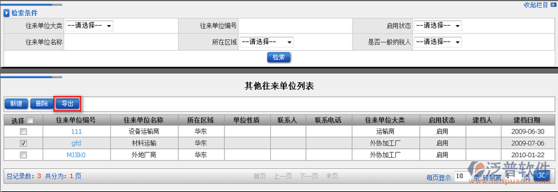 3、其他往來單位列表為用戶提供導(dǎo)出功能,選中需要導(dǎo)出的單位信息,點擊【導(dǎo)出】即可。如圖: