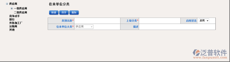 往來(lái)單位是指兩個(gè)經(jīng)濟(jì)實(shí)體因有業(yè)務(wù)發(fā)生而形成的經(jīng)濟(jì)往來(lái),提前對(duì)相關(guān)的往來(lái)單位進(jìn)行分類設(shè)置方便后期使用。往來(lái)單位分類主要包含的屬性有:類別名稱、上級(jí)分類、往來(lái)單位大類