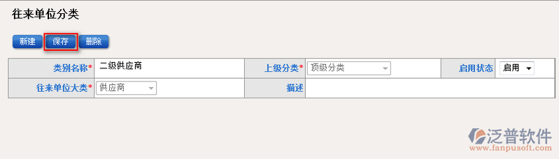 3、填寫完往來(lái)單位分類中的信息,即可點(diǎn)擊【保存】完成新增。如圖: