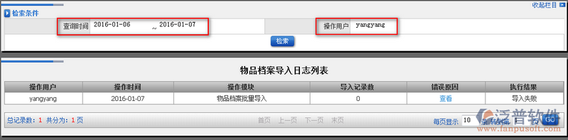 2、通過上圖中的【檢索條件】用戶可以快速查詢導入日志。如圖: