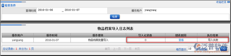 3、查看到的物品檔案導入日志會以列表形式顯示在主頁面中。在此可以看到成功導入的:數(shù)量、發(fā)生錯誤原因以及執(zhí)行結(jié)果。如圖:
