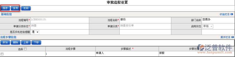 4、填寫完所有的信息后,點擊【保存、發(fā)布】即可完成流程的配置。在相應(yīng)的單據(jù)下就可使用該流程。如圖: