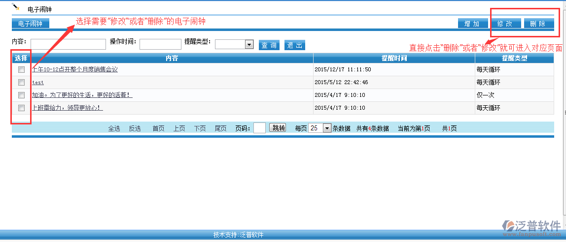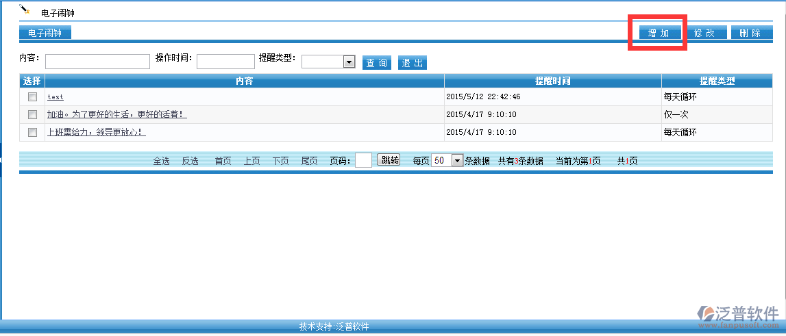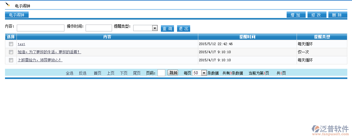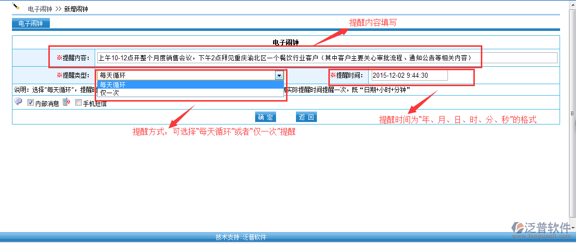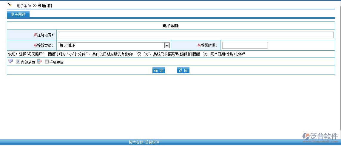 日常工作或生活中常常會(huì)遇到由于事務(wù)繁忙或要處理的事太多,健忘,無(wú)序的事務(wù)管理。泛普軟件OA辦公系統(tǒng)提供人性化電子鬧鐘,支持每日循環(huán)提醒或者僅按設(shè)定好的時(shí)間提醒一次。支持系統(tǒng)內(nèi)部消息提醒同時(shí)支持手機(jī)短信提醒。