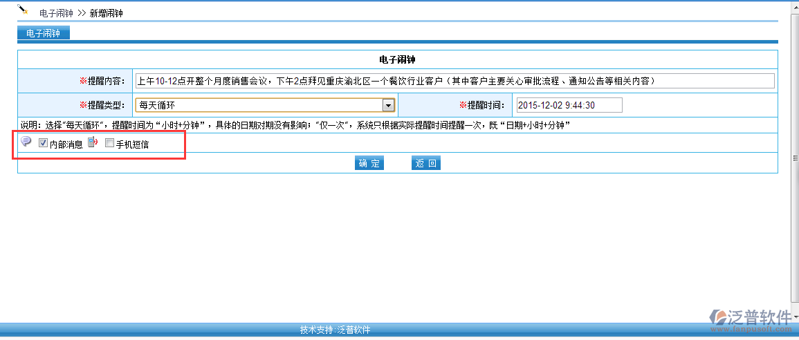 電子鬧鐘提醒可以通過(guò)系統(tǒng)【內(nèi)部消息】或者【手機(jī)短信】方式進(jìn)行提醒。如勾選”內(nèi)部消息“,系統(tǒng)將會(huì)采取內(nèi)部消息的方式提醒。如”勾選“手機(jī)短信”,系統(tǒng)將會(huì)采取手機(jī)短信的方式提醒。