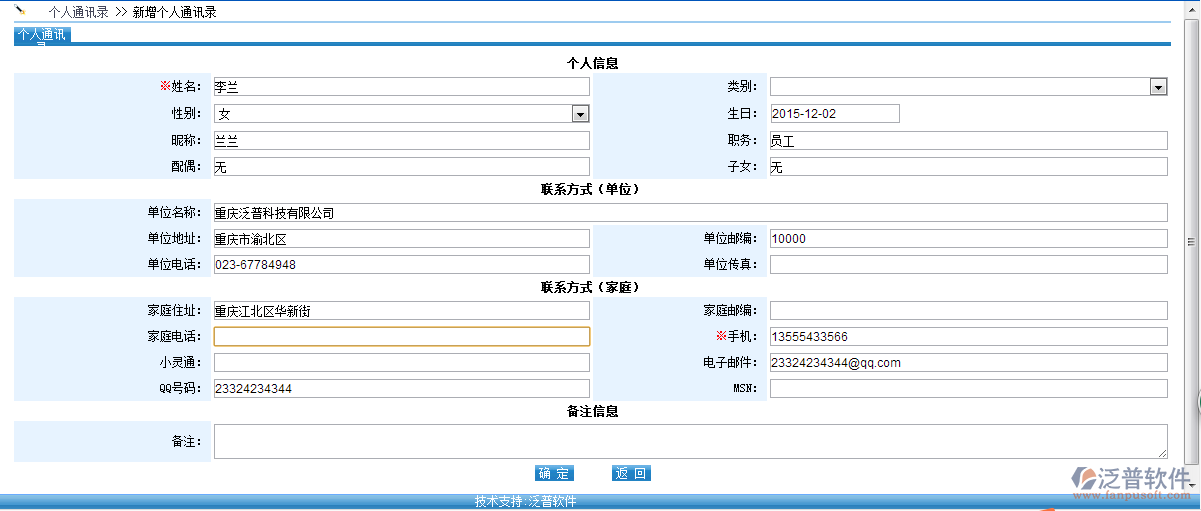 當用戶新建個人聯(lián)系人信息的時候,可以填寫個人信息、聯(lián)系方式(單位)、聯(lián)系方式(家庭)及備注信息