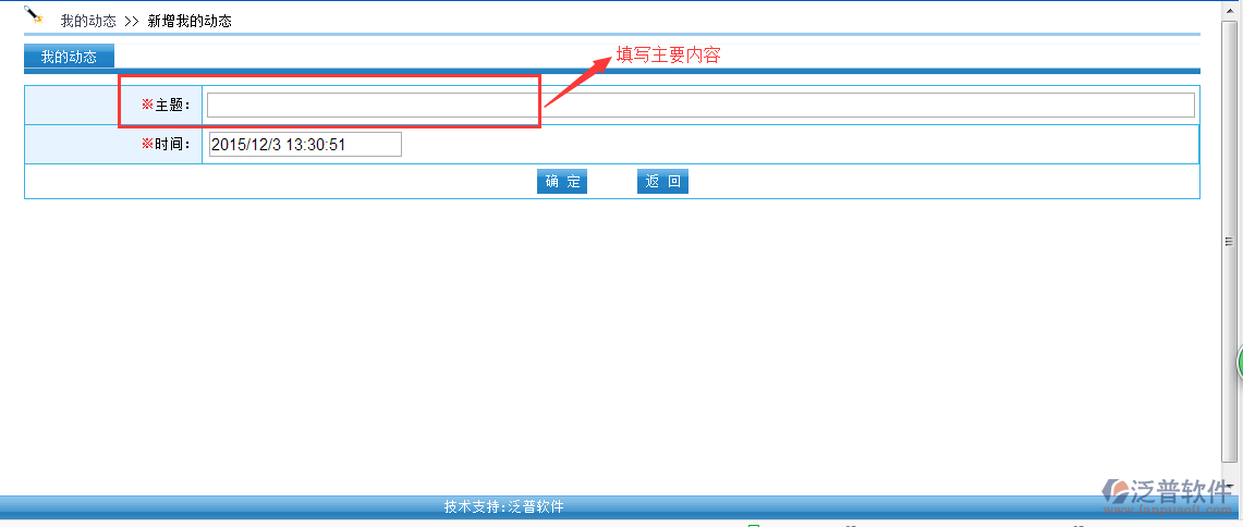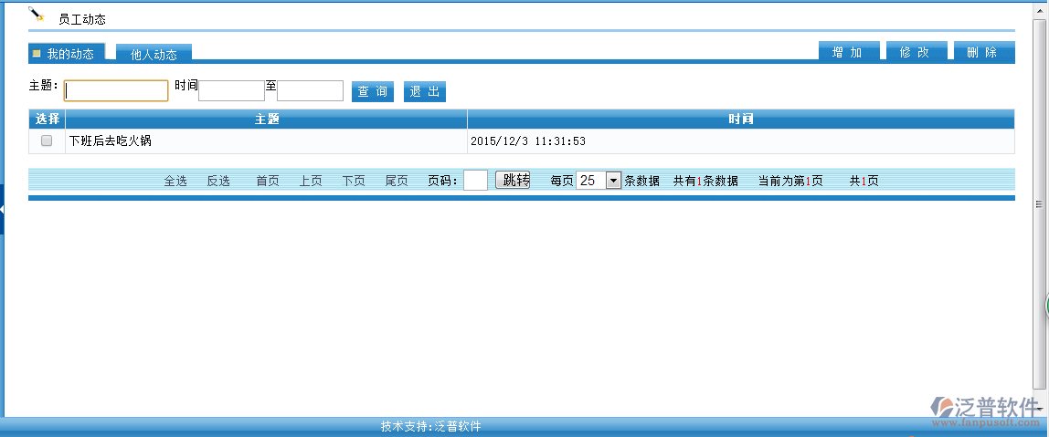 員工動(dòng)態(tài)是將個(gè)人日常事務(wù)、自己工作中的事情記錄到其中,方便自己查詢。點(diǎn)擊【增加】頁面可以即可,在主題欄內(nèi),填寫相關(guān)的主要內(nèi)容。