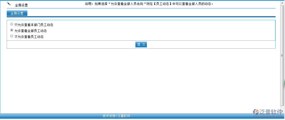 OA系統(tǒng)全局設(shè)置主要開放整個(gè)員工動(dòng)態(tài)的權(quán)限,在全局設(shè)置中可以設(shè)置“只能查看本部門員工動(dòng)態(tài)”“全部員工動(dòng)態(tài)”以及“不允許查看員工動(dòng)態(tài)”。這3種狀態(tài)需要按照實(shí)際情況,讓管理員進(jìn)行統(tǒng)一設(shè)置。