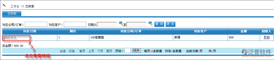 “已收款”對應(yīng)的是“合同/訂單—回款記錄”。