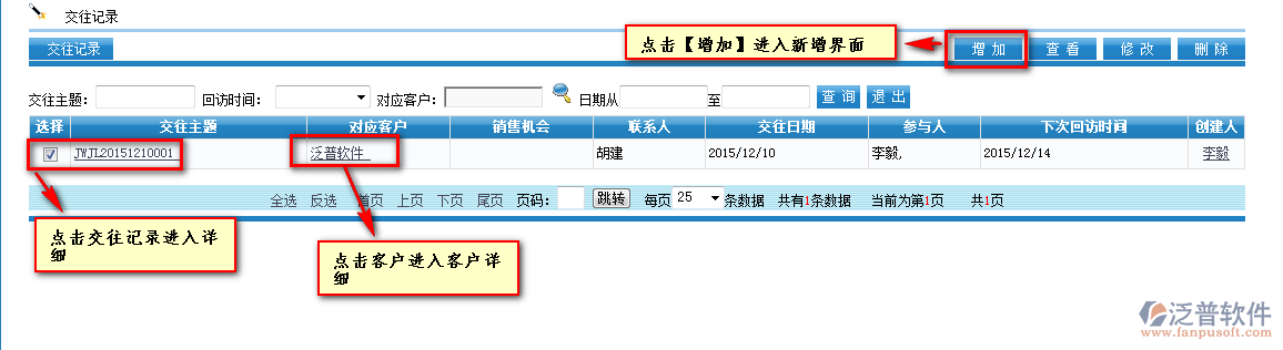 首先進(jìn)入到【銷售系統(tǒng)】—【客戶跟蹤】—【交往記錄】,如圖: