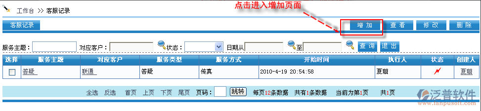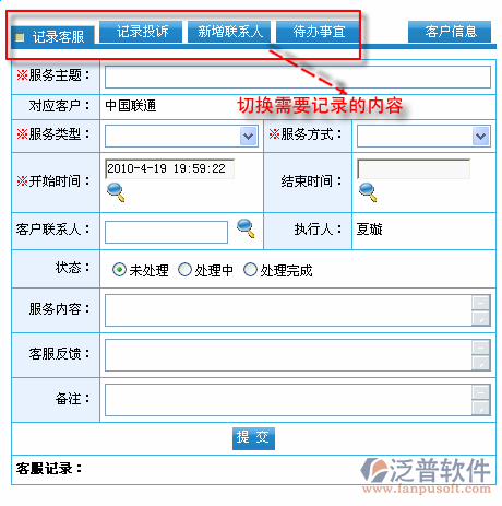 首先進(jìn)入到【銷售系統(tǒng)】—【客戶服務(wù)】—【客服記錄】,如圖: