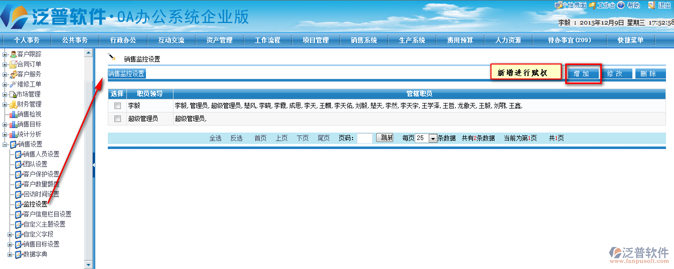要使用此模塊首先得賦予客戶(hù)監(jiān)控的權(quán)限及范圍,首先進(jìn)入【銷(xiāo)售系統(tǒng)】—【銷(xiāo)售設(shè)置】—【監(jiān)控設(shè)置】