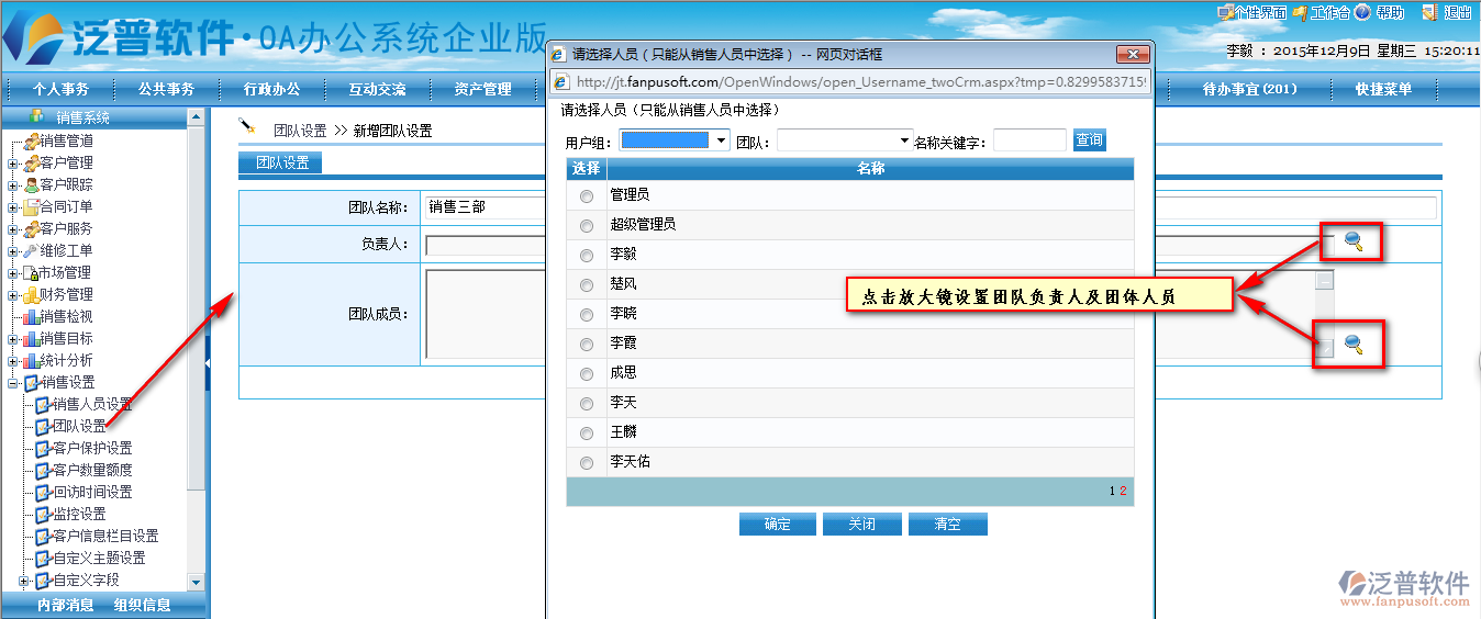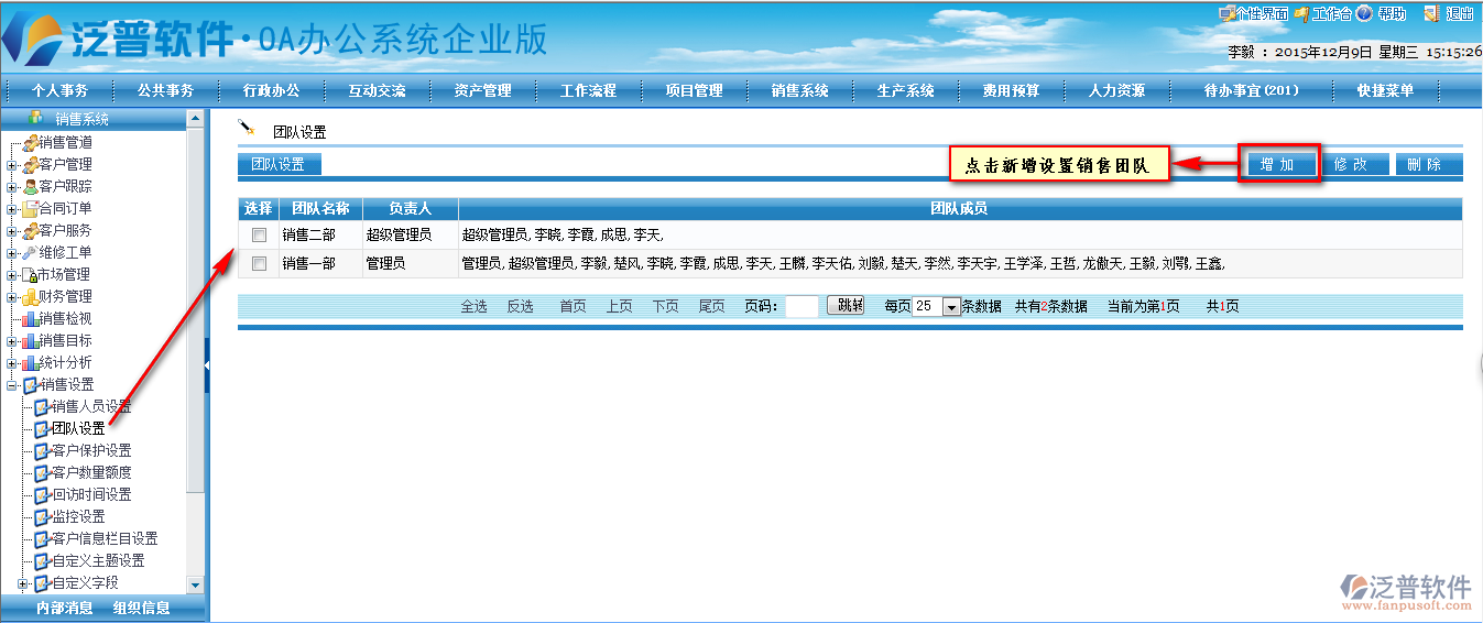首先進(jìn)入【銷(xiāo)售系統(tǒng)】—【銷(xiāo)售設(shè)置】—【團(tuán)隊(duì)設(shè)置】