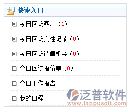 【快速入口】:迅速掌握自己當(dāng)天工作內(nèi)容,可以快速進(jìn)入今日回訪客戶、查詢今日回訪交往記錄、今日可以拜訪的銷售機(jī)會(huì)、今天可以做回訪的報(bào)價(jià)客戶、快速進(jìn)入工作日志的填寫