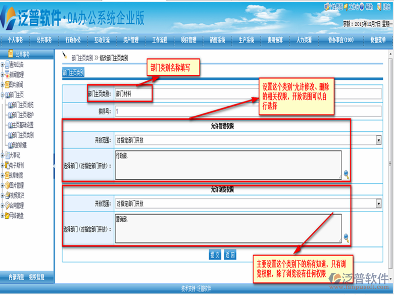每個(gè)部門(mén)中所有的類(lèi)別,都可以在OA系統(tǒng)的部門(mén)類(lèi)別中進(jìn)行設(shè)置,例如:材料類(lèi)、制度類(lèi)等。相關(guān)信息填寫(xiě)完成點(diǎn)擊【提交】