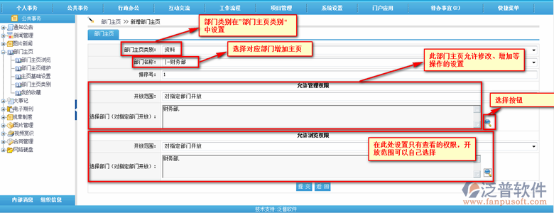 OA系統(tǒng)的部門(mén)主頁(yè)設(shè)置主要關(guān)聯(lián)到各個(gè)部門(mén)中,點(diǎn)擊【添加】進(jìn)入主要基礎(chǔ)設(shè)置頁(yè)面