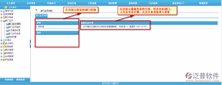 OA部門(mén)瀏覽主要放本部門(mén)的所有信息。開(kāi)放的范圍廣泛也可以看到其他部門(mén)的相關(guān)部門(mén)主頁(yè)
