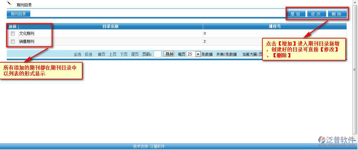 OA期刊目錄按照列表顯示。整個期刊目錄中可以進行【增加】、【刪除】、【修改】操作