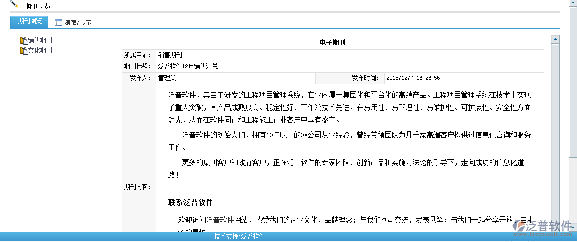 電子期刊是對企業(yè)期刊的發(fā)布、查詢、設(shè)置進行管理。支持按部門、人員進行發(fā)布。支持多種期刊名的錄入,并可在期刊中添加附件。支持樹型結(jié)構(gòu)瀏覽期刊目錄,方便閱讀與查詢。支持正文直接模版調(diào)用。便于支持發(fā)布Word、Excel、Html、各種圖片等。