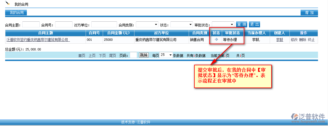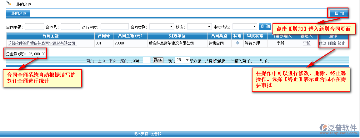 在【我的合同】頁面,可以直接進(jìn)行增加新的合同,以及刪除、修改或者停止此合同的審批狀態(tài)等
