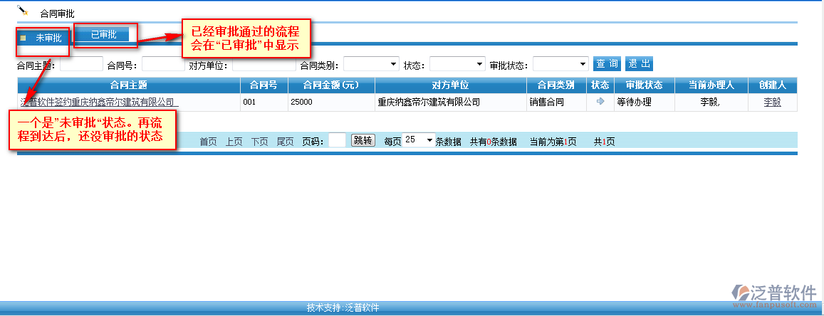 合同填寫完成后,整個合同即將進(jìn)入一個審批狀態(tài),再【合同審批】模塊中就可以查看有哪些合適是需要審批的
