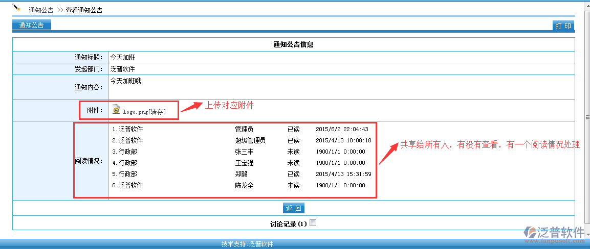 通知公告發(fā)布后可以直接查看用戶對通知的閱讀狀態(tài),隨時(shí)顯示閱讀的人員和數(shù)量,以及閱讀人員完成情況都可以詳細(xì)查看。在【閱讀情況】中可以詳細(xì)查看每個(gè)員工查看的情況