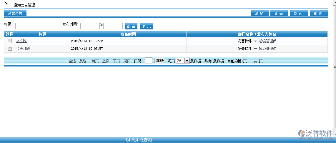 在OA通知公告頁面中可以直接新增、刪除、修改等操作,同時(shí)可以通過標(biāo)題、發(fā)布時(shí)間查詢用戶想要的通知公告。公告通知的附件是可以在發(fā)布的時(shí)候直接在線編輯的,發(fā)布公告通知的時(shí)候要選擇此公告的附件是否是可以被人下載和打印,如果所帶的附件是Office文檔,可對Office文檔進(jìn)行在線編輯。公告通知的內(nèi)容可以是圖片、表格等形式。點(diǎn)擊【增加】進(jìn)入新增通知公告界面