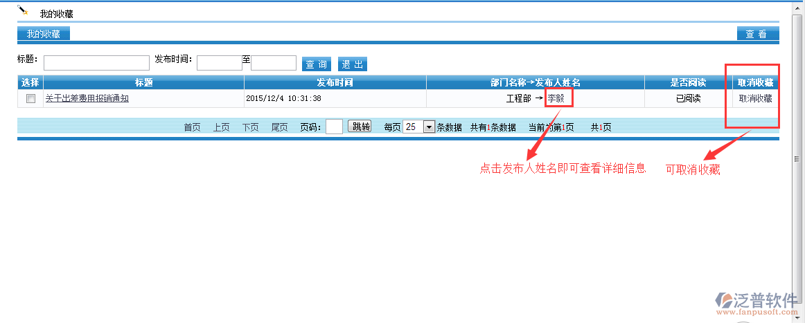 在通知瀏覽中查看時(shí),點(diǎn)擊了”收藏“按鈕,對應(yīng)的通知公告即將到達(dá)【我的收藏】中保存。同時(shí)可以直接【取消收藏】。在收藏的通知公告比較多時(shí),可以通過標(biāo)題或者發(fā)布時(shí)間直接進(jìn)行查詢