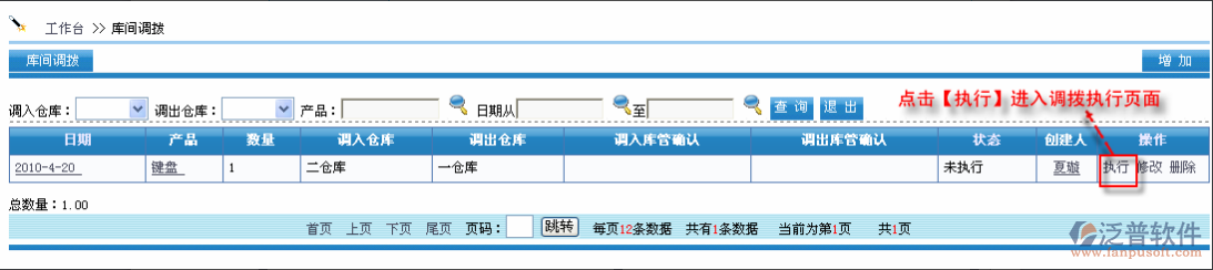 點(diǎn)擊【提交】保存數(shù)據(jù),然后返回調(diào)撥列表頁面執(zhí)行,然后點(diǎn)擊此行數(shù)據(jù)后的【執(zhí)行】完成調(diào)撥,如圖: