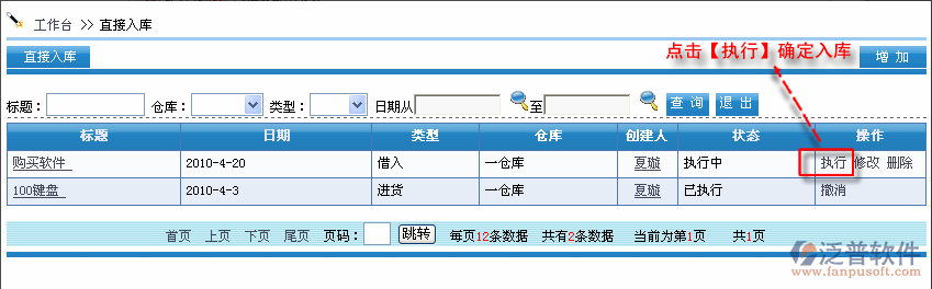 新增完明細以后,點擊【設(shè)置完成并返回】返回入庫列表,然后點擊此行數(shù)據(jù)后的【執(zhí)行】則入庫完成,如圖: