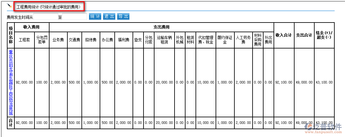 工程費(fèi)用統(tǒng)計(jì):(此報(bào)表以收支兩條線來統(tǒng)計(jì)工程成本,收入來源于工程款回收,支出根據(jù)支出類型分類來的,在報(bào)銷或者申請(qǐng)的時(shí)候選擇對(duì)應(yīng)分類統(tǒng)計(jì)支出費(fèi)用)