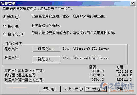在 【安裝類型】 窗口,選擇【典型】 安裝選項,并指定 【目的文件夾】。程序和數(shù)據(jù)文件的默認安裝位置都是 "C:Program FilesMicrosoft SQL。筆者因為C盤是系統(tǒng)區(qū)、D盤是應用區(qū),因此選擇了D盤。注意,如果你的數(shù)據(jù)庫數(shù)據(jù)有10萬條以上的話,請至少預留1G的存儲空間,以應付需求龐大的日志空間和索引空間。