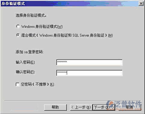 在 【身份驗證模式】窗口,請選擇【混合模式..】 選項,并設置管理員【sa】賬號的密碼。OA/E的數(shù)據(jù)庫連接密碼默認為:sa,