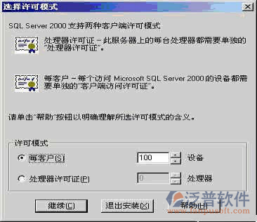 在【選擇許可模式】窗口,根據(jù)您購買的類型和數(shù)量輸入(0表示沒有數(shù)量限制)。【每客戶】表示同一時間最多允許的連接數(shù),【處理器許可證】表示該服務器最多能安裝多少個CPU。這里選擇了【每客戶】 并輸入了100作為示例。注:網(wǎng)絡上的共享版不用設置此步驟即可無限用戶數(shù)。