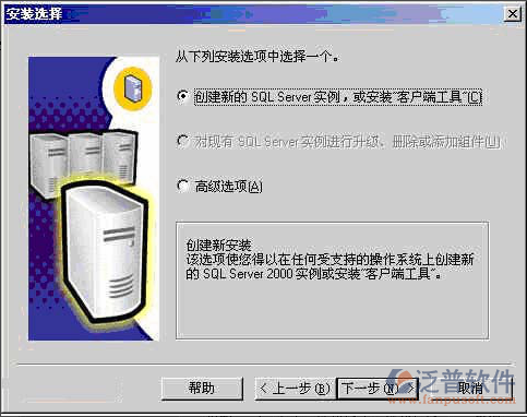 在 【安裝選擇】 窗口中選擇 【創(chuàng)建新的SQL Server實例...】。對于初次安裝的用戶,應選用這一安裝模式,不需要使用 【高級選項】 進行安裝。 【高級選項】 中的內(nèi)容均可在安裝完成后進行調(diào)整。
