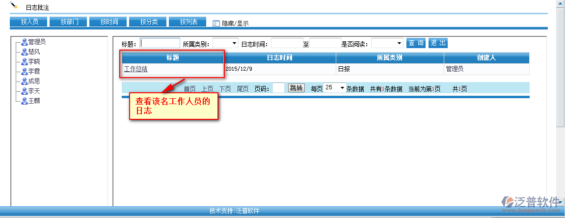 日志批注就是讓領(lǐng)導監(jiān)控員工日志的一個功能,在日志批注中可以按照人員、部門等相關(guān)信息查看。