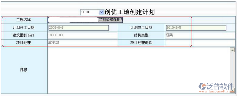 安全施工創(chuàng)優(yōu)計(jì)劃:本模塊按年度登記創(chuàng)優(yōu)工地計(jì)劃,如下圖所示,紅色框選的字段自動(dòng)從該工程基本信息中自動(dòng)獲取,在此只需填寫 “目標(biāo)”欄信息。