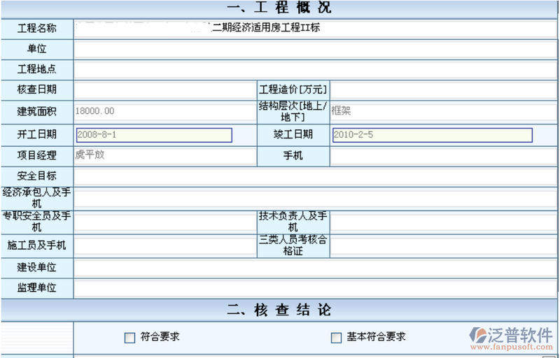 開工安全生產(chǎn)條件檢查:界面如下圖所示,工程概況中的記錄為自動(dòng)帶出來的類容,核查結(jié)論需根據(jù)實(shí)際檢查結(jié)果來判定。