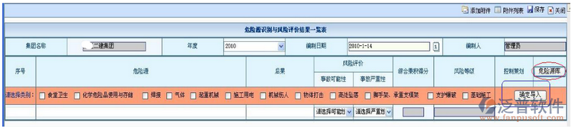 集團(tuán)年度危險(xiǎn)源辨識(shí)和風(fēng)險(xiǎn)評(píng)價(jià),如下圖所示,點(diǎn)擊紅色圈選的“危險(xiǎn)源庫”按鈕可調(diào)用庫中的模板,下面會(huì)出現(xiàn)紅色底紋顯示的選項(xiàng),勾選要評(píng)價(jià)的項(xiàng)目點(diǎn)擊藍(lán)色框選的“確定導(dǎo)入”按鈕,下面可對(duì)顯示選中項(xiàng)進(jìn)行評(píng)價(jià)。