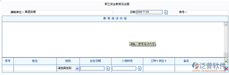 安全培訓(xùn)是安全生產(chǎn)管理工作中一項十分重要的內(nèi)容,它是提高全體勞動者安全生產(chǎn)素質(zhì)的一項重要手段。企業(yè)安全教育培訓(xùn)計劃記錄,登記已經(jīng)培訓(xùn)的安全教育情況記錄。登記界面如下圖所示: