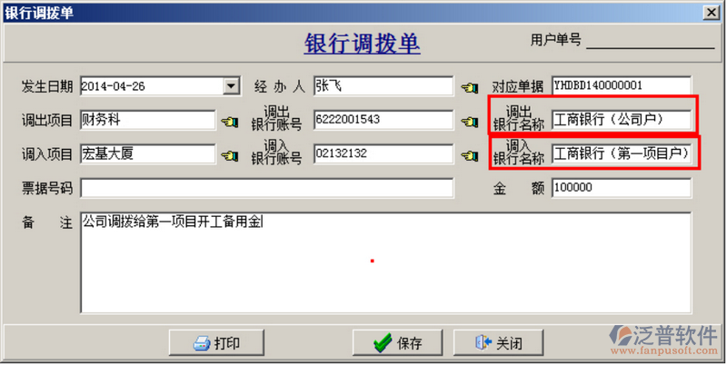(3)公司給項目部(或子公司)撥款做【銀行調撥單】,其中調出銀行為總公司的銀行賬號,調入銀行為項目部(或子公司)的銀行賬號,如下圖: