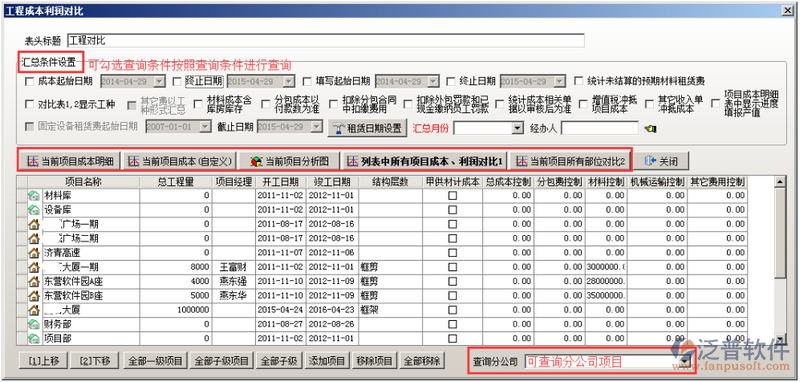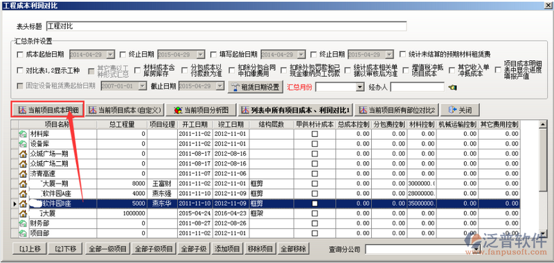 查看項目與項目之間的成本利潤對比,輸入查詢條件,點擊“列表中所有項目成本利潤對比1”,如圖