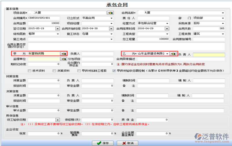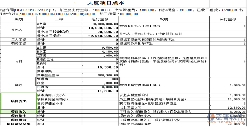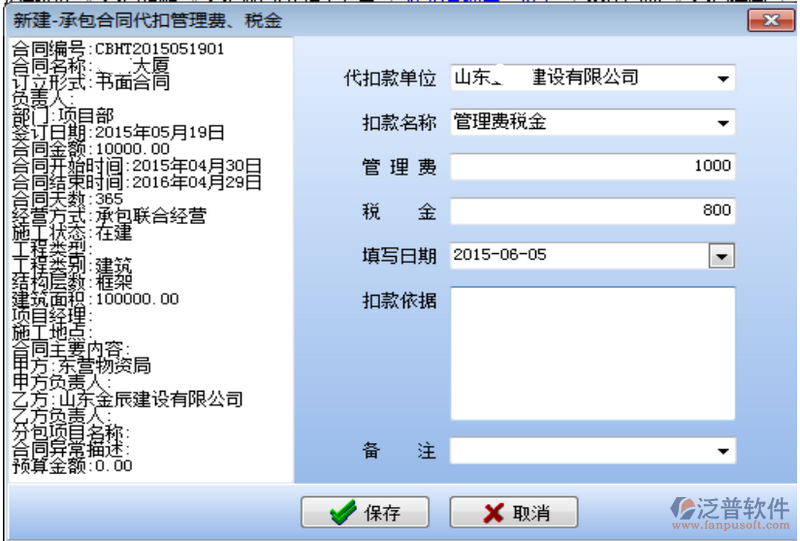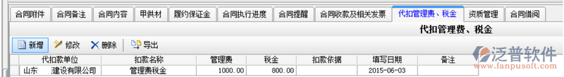 因為借用乙方B的資質,需要扣除管理費,如果需要乙方B代開發(fā)票還需要扣除稅金。在承包合同中[代扣管理費稅金]模塊下操作,如下圖: