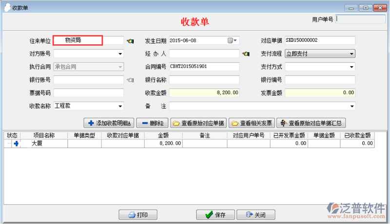 如果收取工程款直接在[合同收款及相關發(fā)票]模塊填寫收款單,如下圖