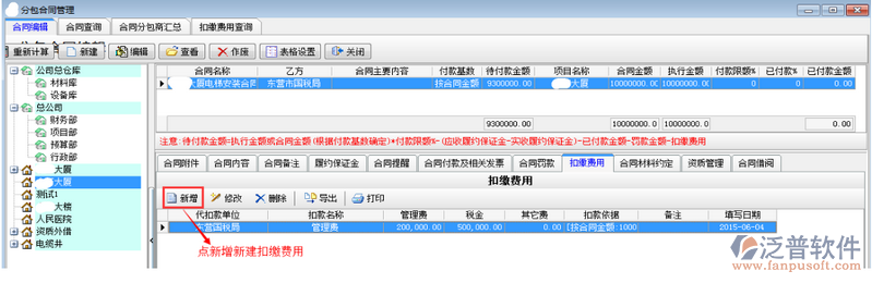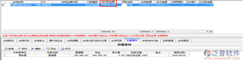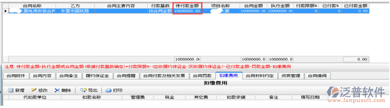 乙方B借用乙方A的資質(zhì),乙方A需要扣除乙方B管理費(fèi),如果需要乙方A代開發(fā)票還需要扣除稅金。在分包合同中[扣繳費(fèi)用]模塊下操作,如下圖: