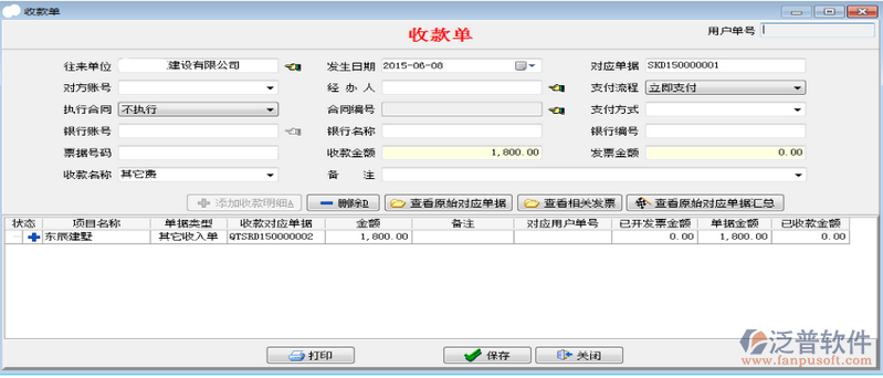 甲方直接把承包款支付給借資質(zhì)公司(乙方B),我公司不會跟甲方產(chǎn)生往來賬款。由于是借的我方的資質(zhì),乙方B需要向我公司支付管理費(fèi)或者稅金。通過其它收入單來記錄這筆費(fèi)用。如下圖: