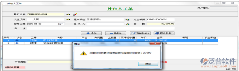 當(dāng)我們驗(yàn)收超過(guò)總額時(shí)系統(tǒng)會(huì)自動(dòng)提示,并且外包人工單不能保存。