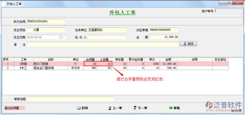 執(zhí)行合同的外包人工單如果超過(guò)合同量,外包人工內(nèi)容顏色會(huì)變成紅色。如下圖: