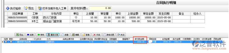 當(dāng)驗(yàn)收完成防火門安裝10個(gè),鋁合金門窗安裝50平之后會(huì)待付款金額則顯示驗(yàn)收金額。如下圖: